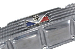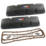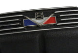 Valve Cover Kit, Red/White/Blue V-8 Logo, Finned Black Wrinkle Aluminum, 1966-91 AMC, Jeep - Allow approximately 2-3 weeks for manufacturing plus shipping