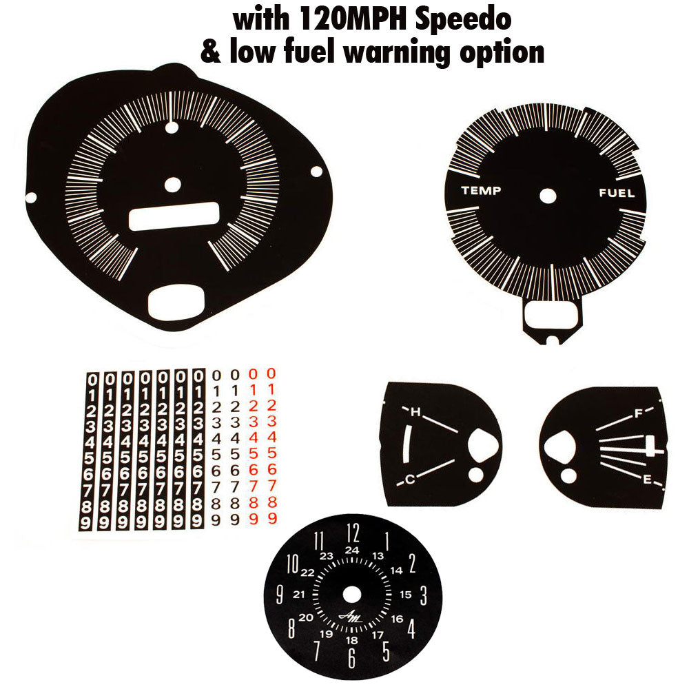 - Kit Includes: 120 MPH speedometer face, gasoline gauge face w/low fuel warning, temperature gauge face, gauge legend for temperature/fuel, odometer numbers, and clock