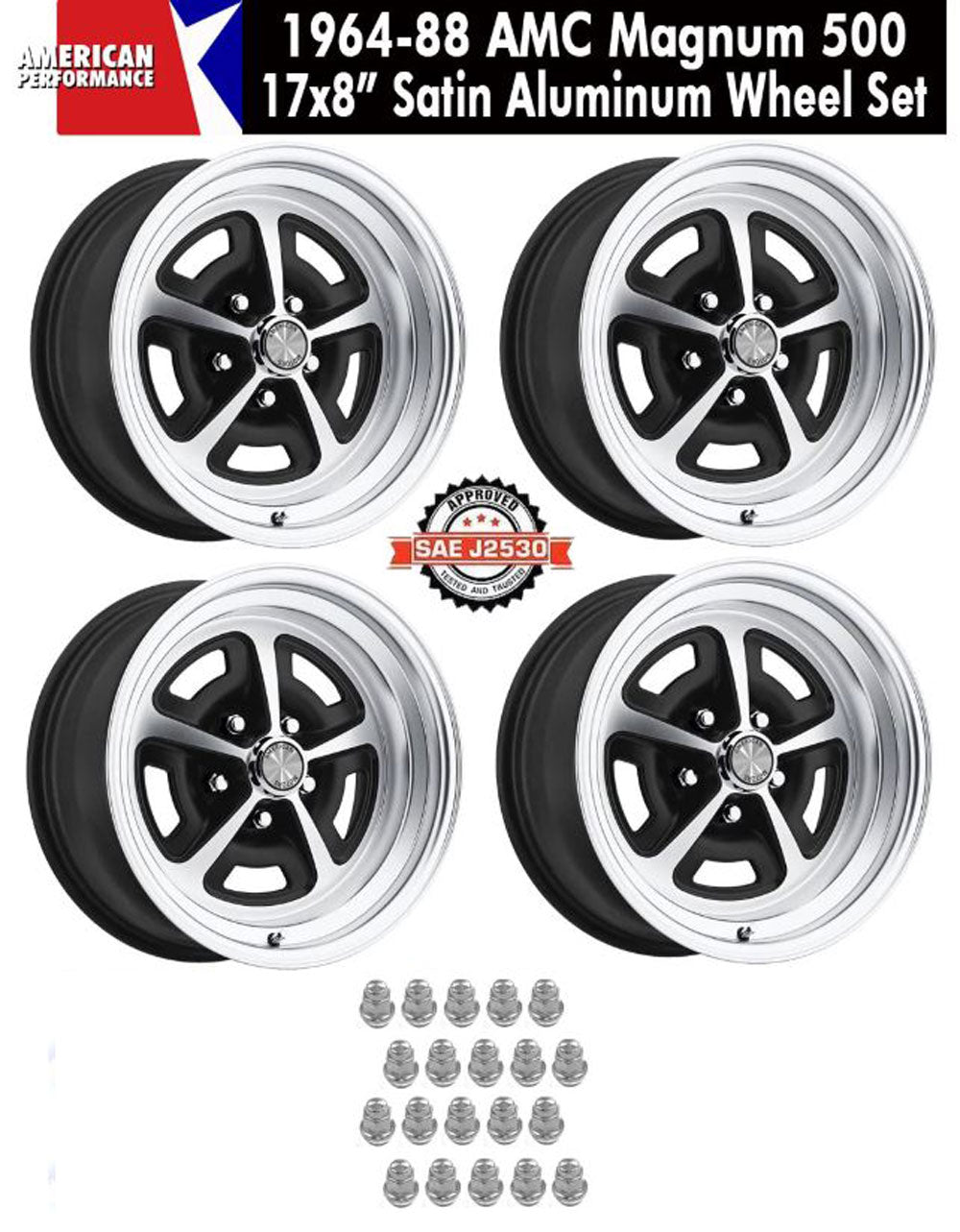 • Includes (4) satin finish cast aluminum Magnum 500 wheels, (4) center caps, (4) reproduction original style American Motors center cap emblems, and (4) reproduction original style AMC stainless chrome lug nuts