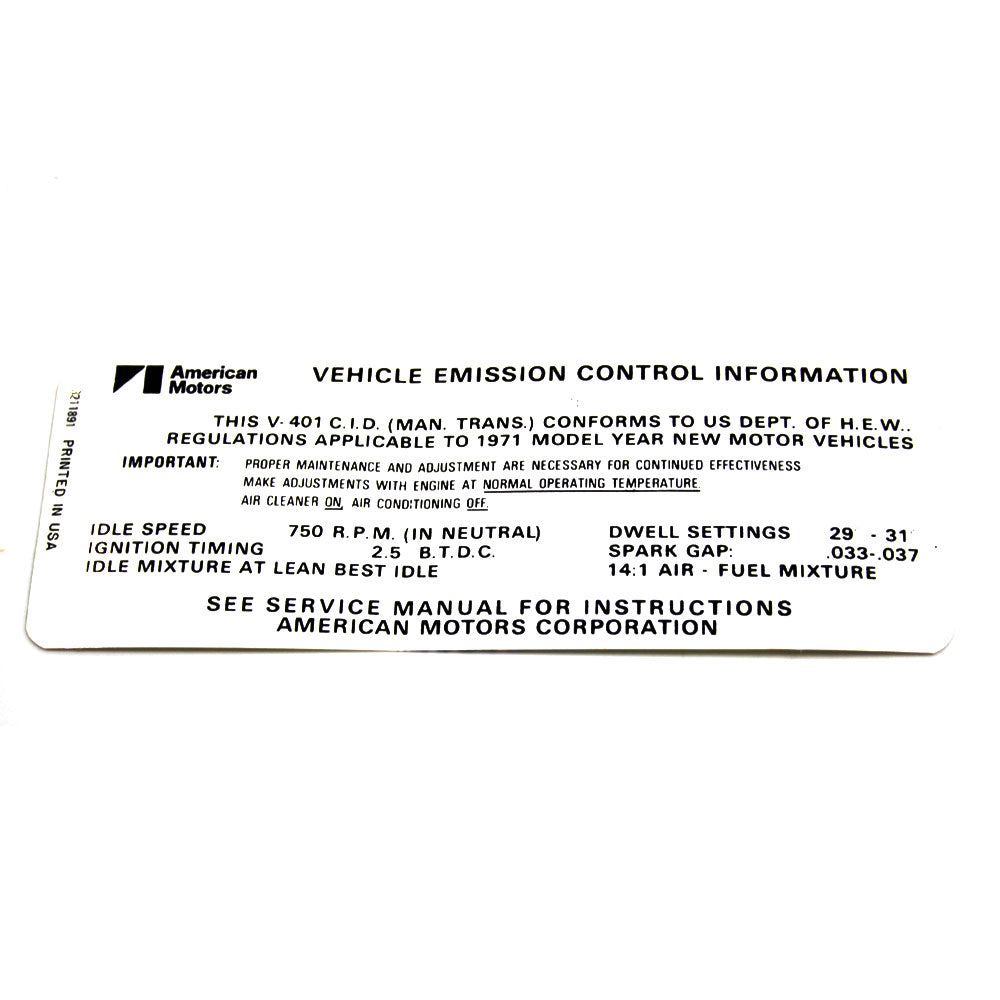 Emission Decal, 401 V-8 Manual Transmission, 1971 AMC