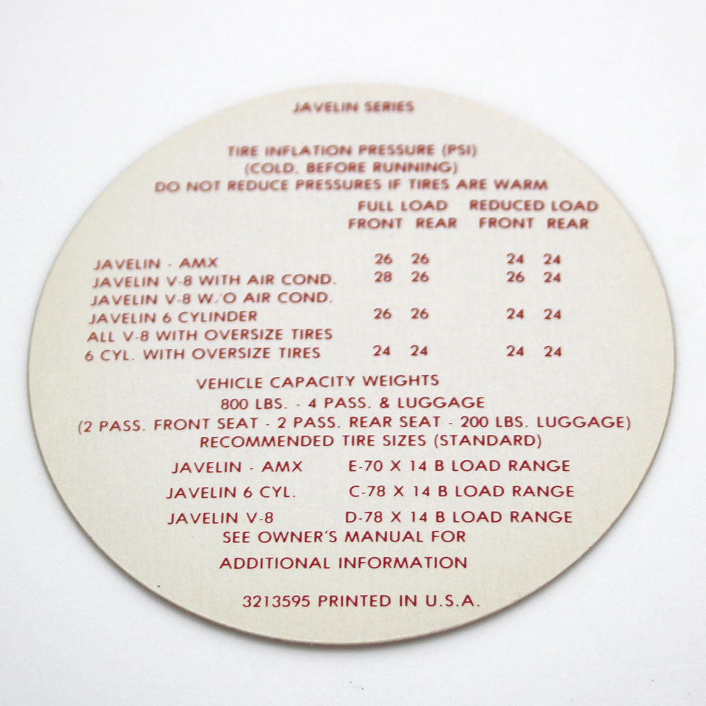 Tire Pressure Decal, 1971 AMC Javelin, Javelin AMX