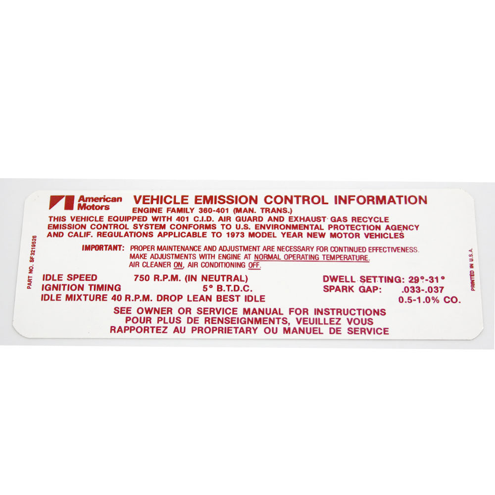 Emission Decal, 401 V-8 Manual Transmission, 3219526, 1973 AMC