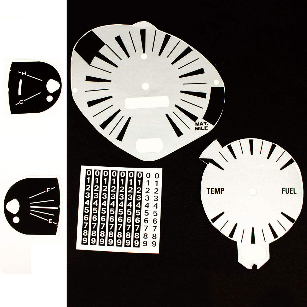 - Kit Includes: 120 MPH speedometer face, gasoline gauge face, temperature gauge face, gauge legend for temperature/fuel, odometer numbers
