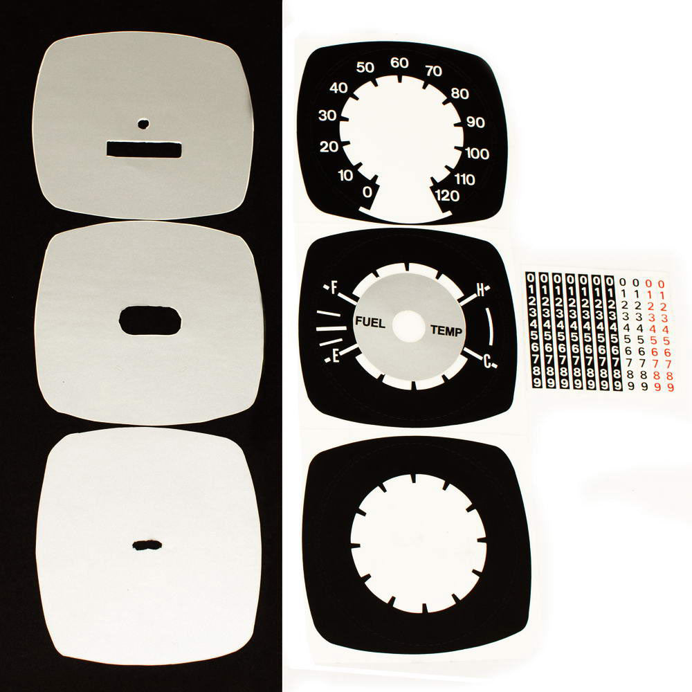 - Kit Includes: 120 MPH speedometer face, fuel gauge face, temperature gauge face, clock delete face, gauge legend